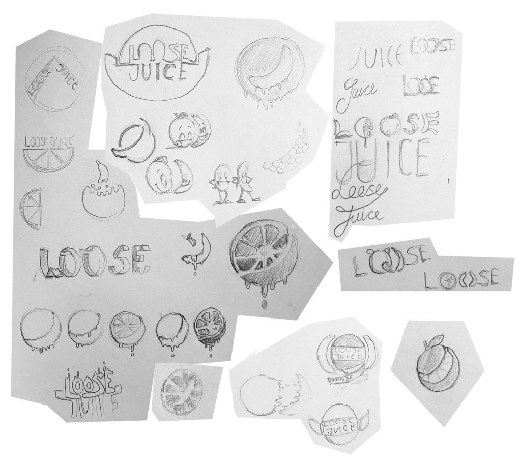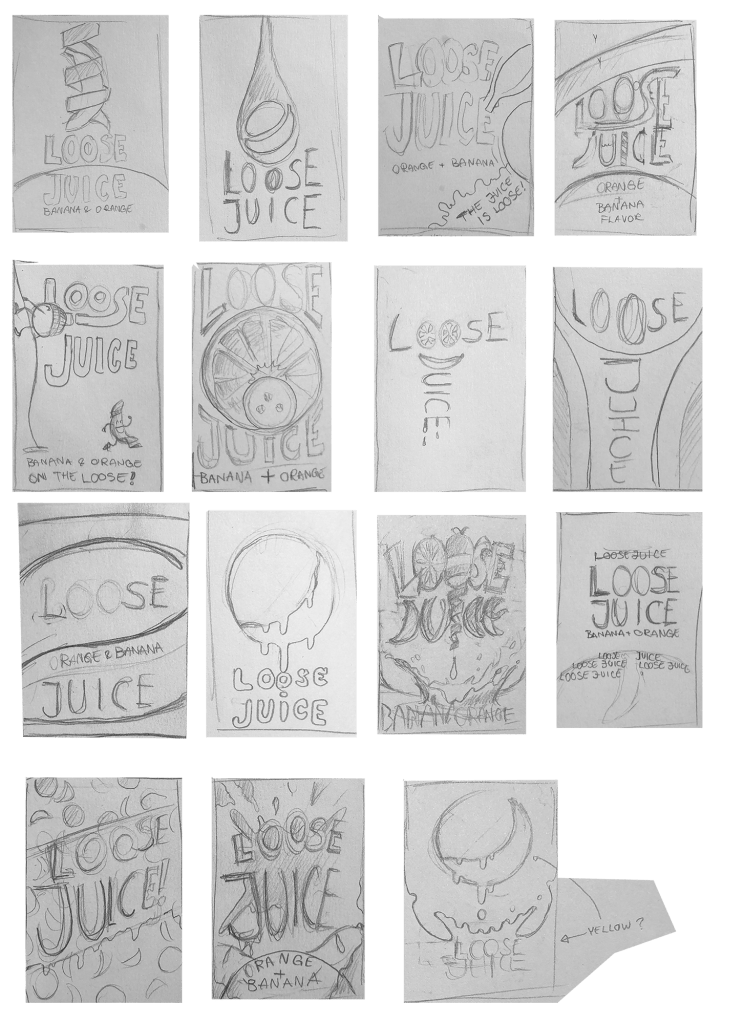 First the scamps, simple, but easy to read product sketches, had to be made. I made 15 of these, along with a few doodles. It was really hard to choose which scamp to proceed with. I really liked the one with the orange and banana slices, as the banana is more commonly illustrated in profile, but the name “Loose Juice” suggested a more whimsical theme. That’s when I started to make “splashy” logos, then started to experiment with fruit characters. I then went back and tried to combine the more elegant designs with the whimsical styles, which is why the orange and banana is “escaping” the frame in one of the scamps. This scamp was the basis for another scamp, which is the one with the orange and banana escaping from somewhere out of frame, and this is how the “on the loose” line came about.