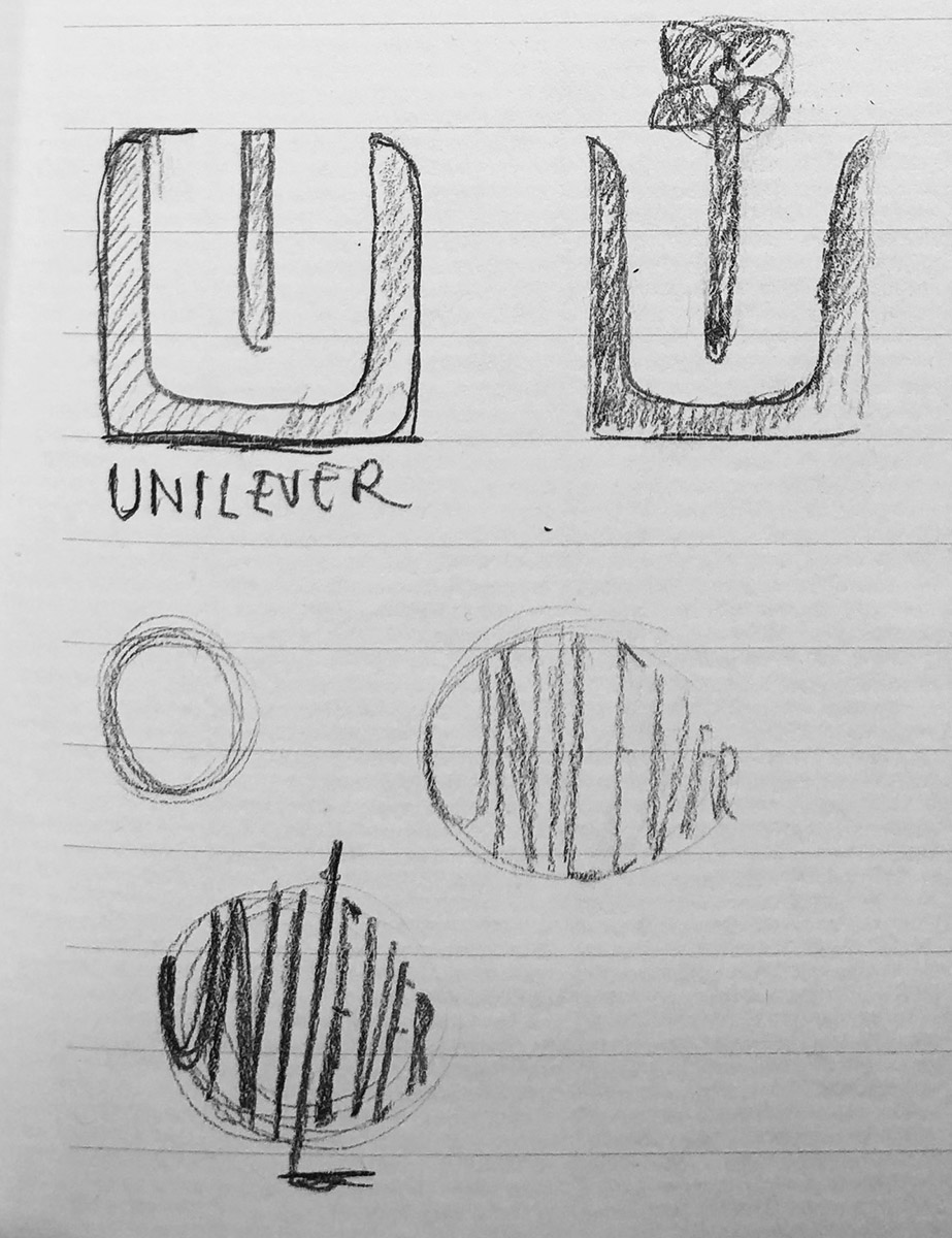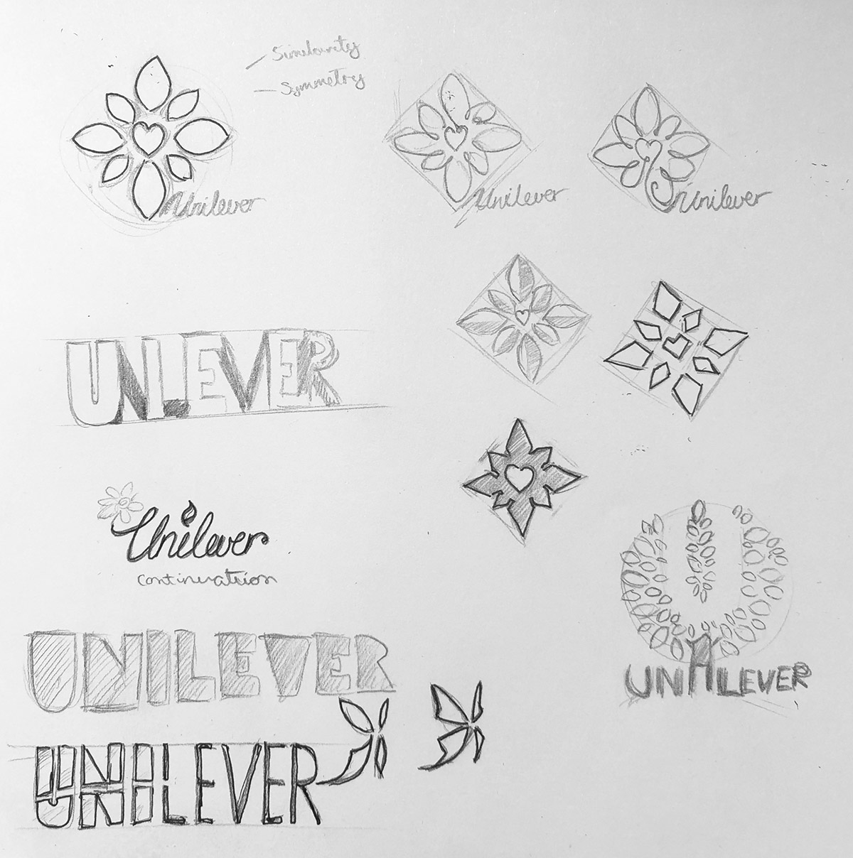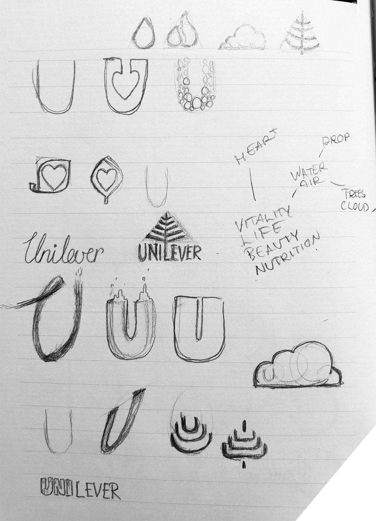 First I started to think about what the company does, and what their values are, and then I started to write down some key words. The sketches went all over the place, so I included the most relevant ones. I wanted to break away from the original design of representing each part of their business, and instead just focus on how they describe their logo: “Unilever is committed to making sustainable living commonplace and our logo is a visual expression of that commitment.” They have also recently started to focus more on beauty and nutritional products, so I played around with that.