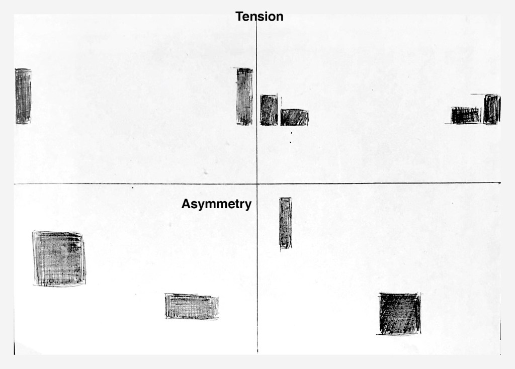 For asymmetry I just mixed up the size of the rectangles and put them off-center. I accidentally created balance with the one to the right,