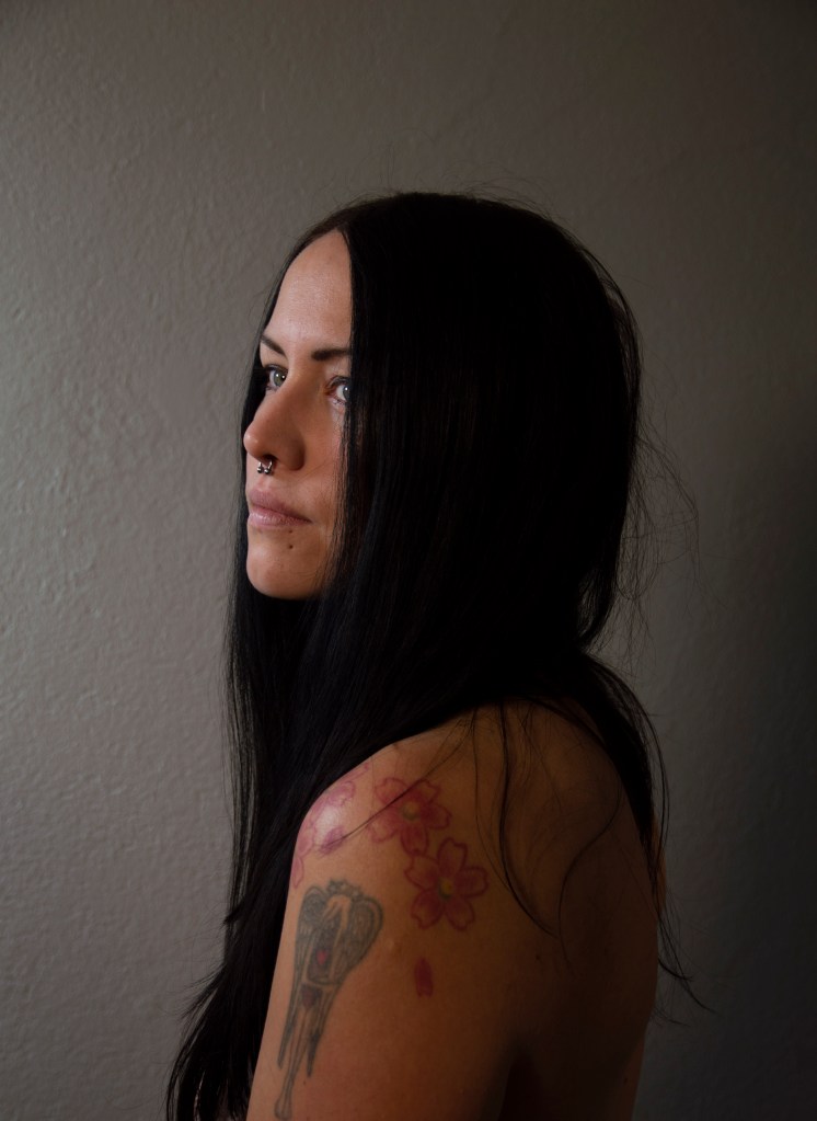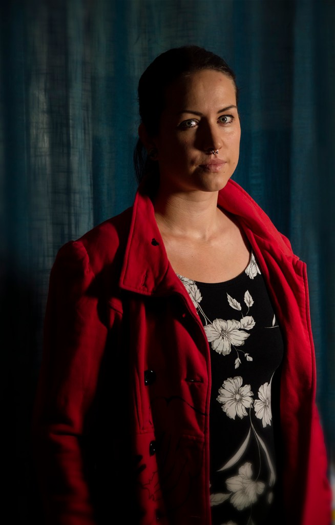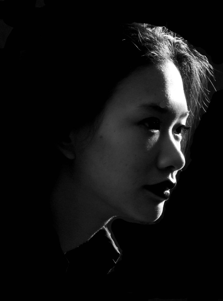 Here I used a single high-intensity LED-light, directed towards the side of the face, while trying to get the classic Rembrandt lighting, which is the triangle of light on the cheek, on the other side of the nose. The window behind the curtain is reflecting some light on the curtain, making some contrast between her and the background.