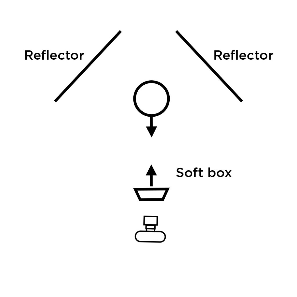 Here I would need a high intensity strobe light in a soft box, to create the dramatic, yet soft lighting associated with fashion photography, the two reflectors are placed to soften the transition from light to shadow, and should be further away from the subject than in the illustration.