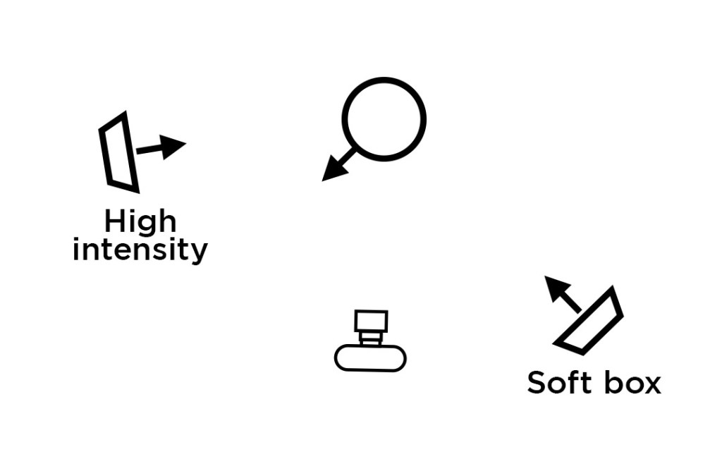 A lower intensity light is placed on the other side of the camera, also angled at 45 degrees.