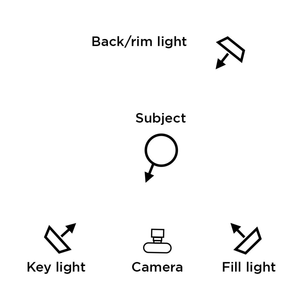A key light, which is the most intense light, is placed to the side of the camera, angled 45 degrees towards the subject.