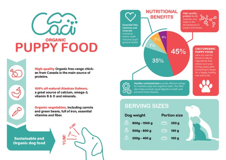 The brochure design and infographic illustration should work together. Consider the format and style of your brochure and illustrate an infographic using fictitious data (or you could do research to get a better idea of actual statistics). The infographic must display the nutritious benefit of your product to dogs. It should contain the nutritional value, as compared to the necessary nutrition intake of dogs. It must also give an indication of consumption per size of dog. You may also add information of your choice that you think is relevant.